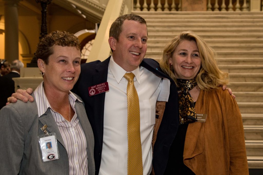 “Left to right: Mrs. Amy Reeves, Rep. Reeves’ parents, Lt. Gov. Cagle, Gov. Deal, Representative Bert Reeves, Rep. Mary Margaret Oliver, and many House members on the stairs.”